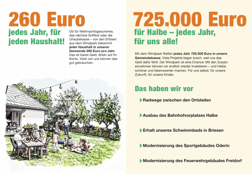 In der Gemeinde Halbe wird derzeit über den geplanten Windpark Freidorf diskutiert. Die Bürgerfraktion Gemeinde Halbe (BFGH), zu der auch Gemeinsam für Halbe gehört, informiert in einer aktuellen Broschüre über mögliche Chancen und Auswirkungen. Neben finanziellen Vorteilen für die Kommune und ihre Bürgerinnen und Bürger stehen dabei auch Fragen des Umwelt- und Artenschutzes im Fokus.